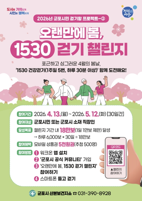 [파이낸셜경제=김기보 기자] 군포시 산본보건지소는 4월 13일부터 5월 12일까지 30일간 시민들의 건강생활실천과 걷기 문화 확산을 위해 모바일 걷기 앱 ‘워크온(WalkOn)’을 활용한 ‘오랜만에 봄, 1530 걷기 챌린지’를 운영한다고 밝혔다.