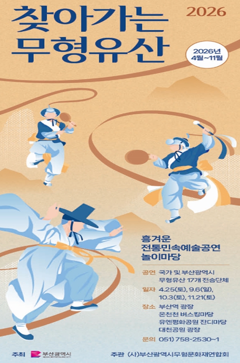 [파이낸셜경제=박영진 기자] 부산시는 무형유산 전통 민속예술의 가치를 확산하고, 신명 나고 흥겨운 전통 민속예술 공연으로 시민들의 삶에 활력을 불어넣기 위해 '2026 찾아가는 무형유산' '전통민속예술공연 놀이마당'을 개최한다고 밝혔다.