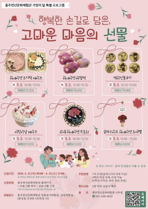 [파이낸셜경제=김영란 기자] 홍성군 홍주천년문화체험관은 가정의 달을 맞아 오는 5월 2일부터 3일까지 이틀간 특별 프로그램 “행복한 손길로 담은 고마운 마음의 선물”을 운영한다.