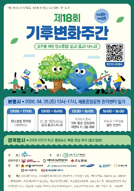 [파이낸셜경제=김영란 기자] 세종특별자치시가 20일부터 25일까지 6일간 중앙공원 일대에서 ‘제18회 기후변화주간’ 행사를 개최한다.