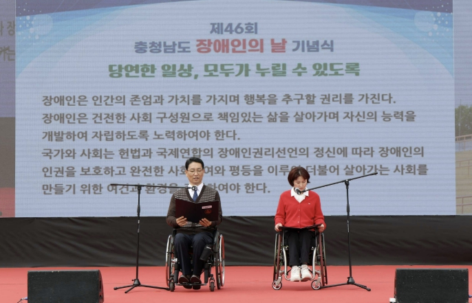 행사는 식전 공연을 시작으로 ▲개회선언 ▲장애인 인권헌장 낭독 ▲충청남도 모범장애인 표창 ▲기념사 및 축사 ▲축하공연 및 시·군 대표 장애인 가요제 순으로 진행됐다. 특히 장애인 복지 증진과 지역사회 발전에 기여한 유공자들에게 표창이 수여될 때마다 참석자들의 큰 박수가 이어졌다.