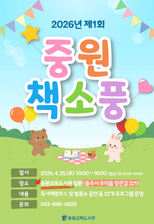 [파이낸셜경제=김기보 기자] 충청북도교육청 직속기관 중원교육문화원은 25일, 충주시 주덕읍에 위치한 중원교육도서관 일원에서 2026년 제1회 '중원책소풍'을 개최한다.