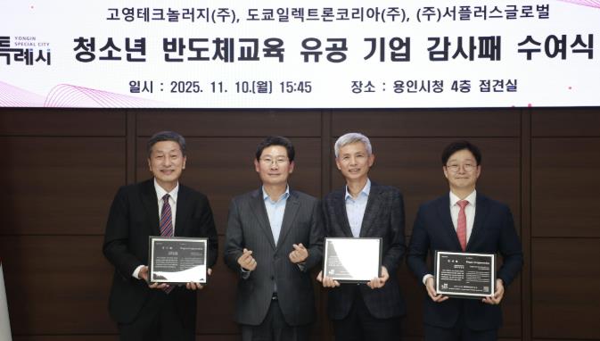 [파이낸셜경제=김영란 기자] 용인특례시는 10일 시청 접견실에서 ㈜서플러스글로벌과 업무협약(MOU)을 체결하고, 지역 청소년 반도체 교육에 기여한 기업 3곳에 감사패를 수여했다고 11일 밝혔다.