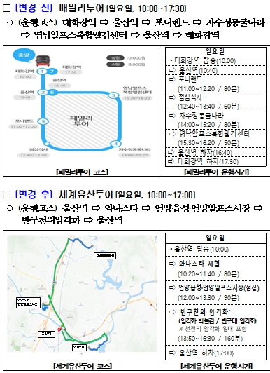 한편 개편된 도시관광(시티투어)은 울산시가 출시한 인공지능(AI)기반 통합 관광온라인체제기반(플랫폼)인 ‘왔어울산’ 누리집이나 앱을 통해 예약 후 이용하면 된다.