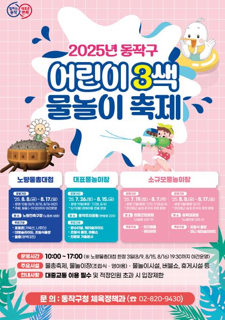 박일하 동작구청장은 “더운 여름을 맞아 아이들에게는 즐거운 놀이를, 보호자에게는 시원한 쉼표를 선물하기 위해 ‘3색 물놀이 축제’를 준비했다”며, “아이들과 가족 모두가 안전하고 유쾌한 여름을 보낼 수 있도록 운영에 만전을 기하겠다”고 말했다.