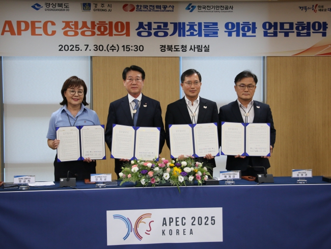 한전은 7월 30일 경북 안동시 경상북도청에서 경상북도, 경주시, 한국전기안전공사와 함께 APEC 정상회의 전력인프라 확충과 무결점 전력공급을 위한 업무협약을 체결했다.