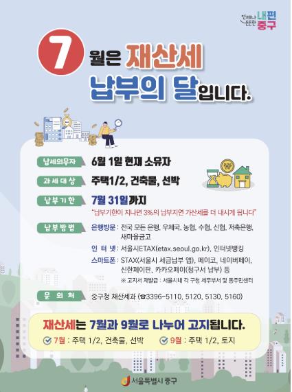 [파이낸셜경제=김예빈 기자] 서울 중구가 7월 정기분 재산세로 671억원을 부과했다. 지난해 보다 25억원 증가한 규모다. 납부 기한은 7월 31일까지로 최종 납기를 넘기면 3%의 납부지연 가산세가 부과되므로 주의해야 한다.