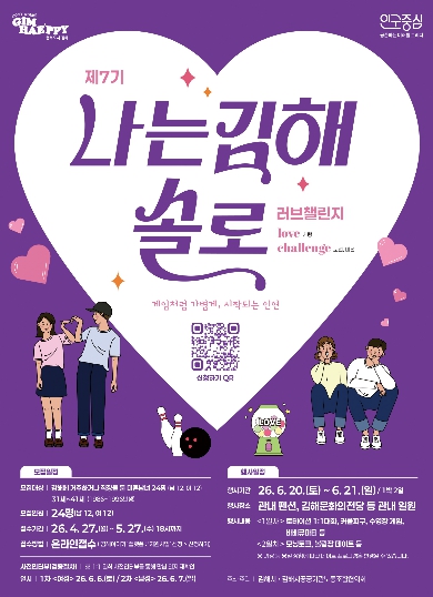 [파이낸셜경제=김예빈 기자] 김해시는 오는 6월 20일부터 21일까지 1박 2일 일정으로 관내 펜션과 김해문화의전당 등에서 진행하는‘제7기 나는 김해솔로-러브챌린지’참가자 24명(남·여 각 12명)을 모집한다고 24일 밝혔다.