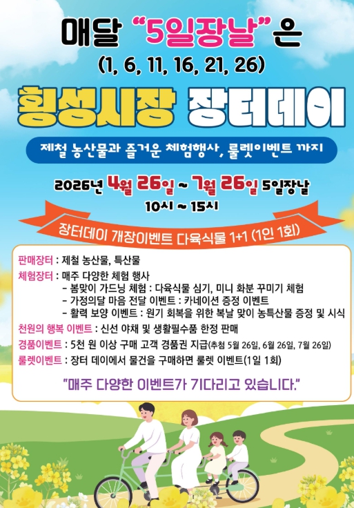 [파이낸셜경제=조성환 기자] 횡성군이 전통시장 내 고객 유입을 촉진하고 지역 경제에 활력을 불어넣기 위해 오는 4월 26일부터 7월 26일까지 ‘2026 횡성전통시장 장터데이’ 행사를 개최한다.
