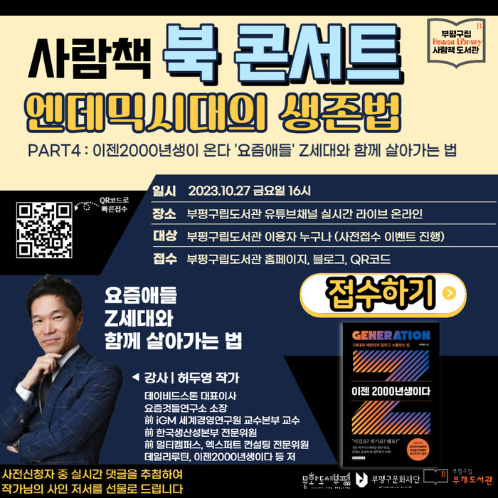 [파이낸셜경제=김기보 기자] 부평구(구청장 차준택) 부개도서관이 오는 26일까지 온라인 사람책 북콘서트 ‘요즘 애들 Z세대와 함께 살아가는 법’ 참여자를 모집한다.