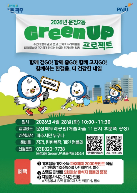 [파이낸셜경제=김기보 기자] 파주시 운정2동은 오는 28일 10시부터 운정 북두레공원에서 주민과 함께하는 시민 참여형 환경·건강 프로그램 ‘제3회 그린 업(Green UP) 프로젝트’를 개최한다.