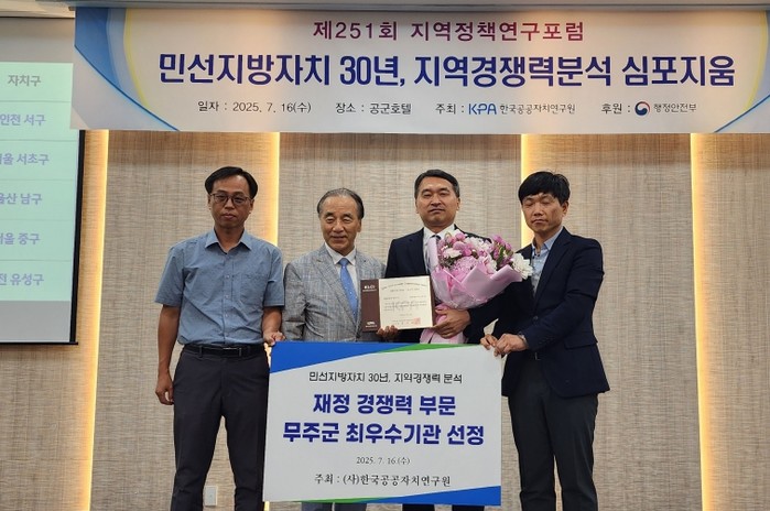 [파이낸셜경제=김예빈 기자] 무주군이 사)한국공공자치연구원이 실시한 ‘민선지방자치 30년, 지역경쟁력 분석’ 결과, 재정 경쟁력 분야에서 전국 82개 군 단위 지방자치단체 중 최우수기관으로 선정되는 영예를 안았다.