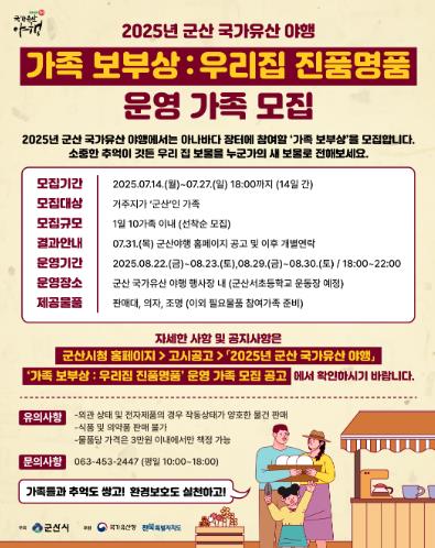 [파이낸셜경제=김예빈 기자] 군산시가 지역의 가족, 기업과 단체를 대상으로 ‘2025년 군산국가유산야행(8월 22일~23일, 8월 29일~30일)’ 야시(夜市) 프로그램 참여자를 공개 모집한다고 10일 밝혔다.