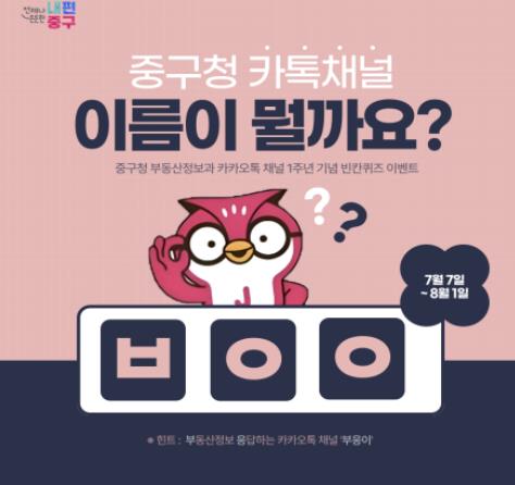 중구는 ‘부응이’ 1주년을 기념하여 8월 1일까지 빈칸 퀴즈 이벤트를 진행한다. 카카오톡 검색창에 ‘서울 중구 부동산정보과’ 또는 ‘부응이’를 입력해 채널을 추가한 후, 채팅 화면 하단의 이벤트 신청을 클릭하고 퀴즈를 풀면 이벤트에 응모할 수 있다. 채널 가입자라면 누구나 참여할 수 있으며, 이벤트 참가자 중 100명을 선정해 커피쿠폰 1매를 제공할 예정이다.