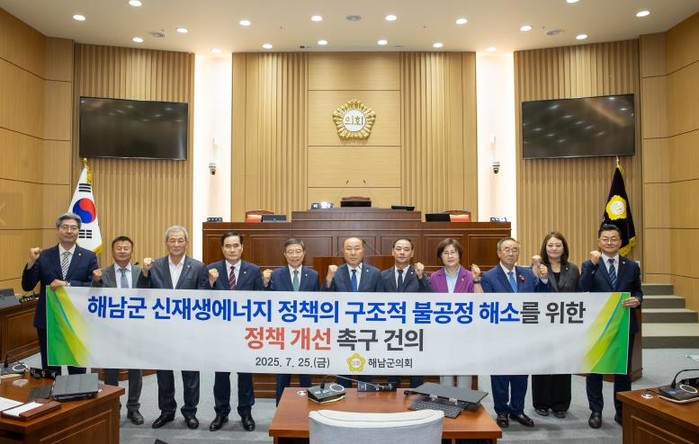 [파이낸셜경제=김예빈 기자] 해남군의회는 지난 25일 열린 제345회 임시회에서 서해근 의원이 대표 발의한 '해남군 신재생에너지 정책의 구조적 불공정 해소를 위한 정책 개선 촉구 건의안'을 채택하고, 신재생에너지 발전의 혜택이 지역민에게 실질적으로 돌아갈 수 있도록 제도 개선을 정부와 한국전력공사에 강력히 촉구했다.