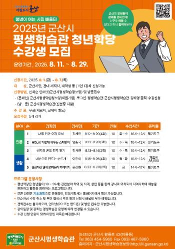[파이낸셜경제=김예빈 기자] 군산시평생학습관이 청년 강사들과 함께 지역사회에 활력을 불어넣는 ‘2025년 청년학당 프로그램’을 오는 8월 11일부터 8월 29일까지 운영한다.