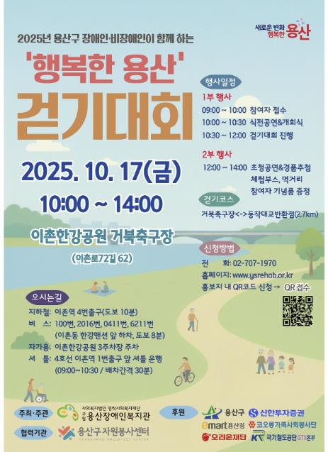 [파이낸셜경제=김예빈 기자] 서울 용산구가 오는 17일 오전 10시 이촌한강공원 거북축구장 및 산책로 일대에서, 구립용산장애인복지관 주최로 열리는 ‘2025 장애인과 비장애인이 함께 하는 행복한 용산 걷기대회’를 후원한다.