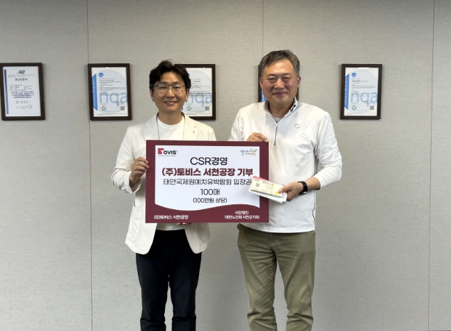 [파이낸셜경제=김영란 기자] 서천군 장항국가생태산단 입주기업인 ㈜토비스(대표이사 하희조·김용범)가 지난 16일 지역 어르신들을 위해 ‘2026 태안 국제 원예치유 박람회’ 입장권 100매를 대한노인회 서천군지회(지회장 김윤태)에 기탁했다.