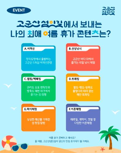 [파이낸셜경제=김예빈 기자] 군산시가 ‘고군산섬잇길’ 공식 사회관계망(gogunsan_seomitgil)에서 댓글 참여형 이벤트 '나의 최애 여름 휴가 콘텐츠'를 진행한다.