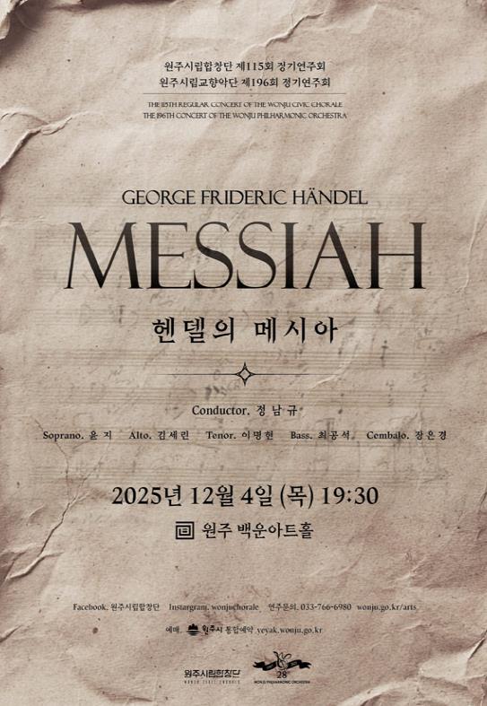 [파이낸셜경제=조성환 기자] 원주 시립합창단과 시립교향악단은 오는 12월 4일 오후 7시 30분 백운아트홀에서 정기연주회 ‘헨델의 메시아’를 개최한다.
