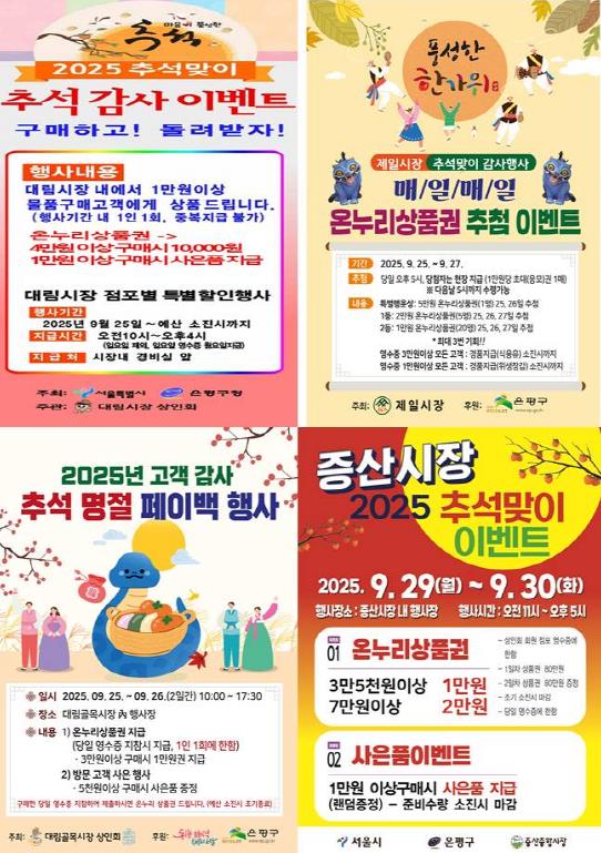 추석 명절 이벤트는 ▲대림시장, 제일시장 오는 25일부터 27일까지 ▲대림골목시장 오는 25일부터 26일까지 ▲증산종합시장 오는 29일부터 30일까지 진행된다.