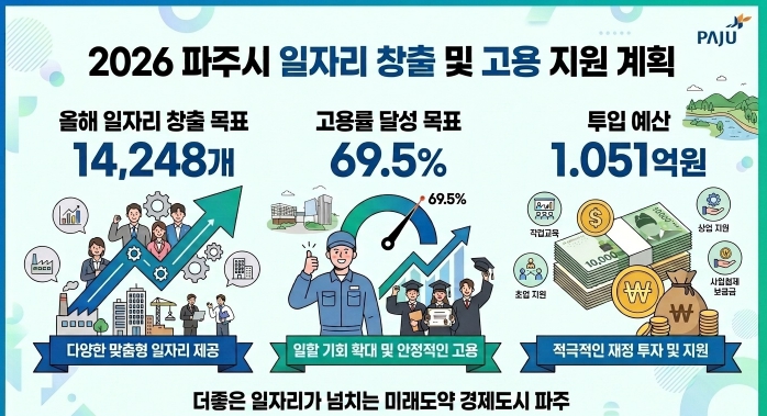 [파이낸셜경제=김기보 기자] 파주시는 2026년 ’일자리 1만 4,248개 창출‘과 ’고용률 69.5% 달성‘을 위해 1,051억 원의 예산을 투입하는 일자리 대책 세부계획을 수립·공시했다.