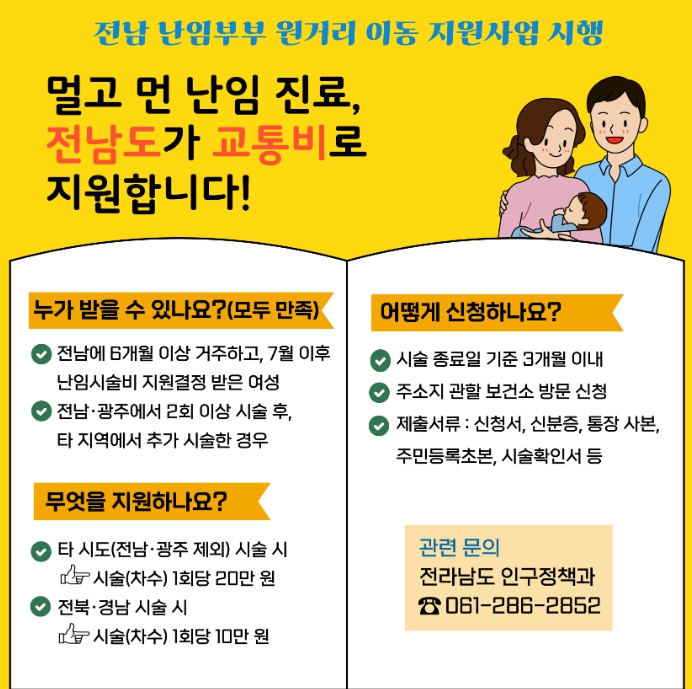 사업은 전남지역에서 시술에 실패해 불가피하게 타 시·도 의료기관에서 시술받은 경우, 시술 차수 1회당 교통비를 전북·경남 지역은 10만 원, 그 외 지역은 20만 원을 지원한다.
