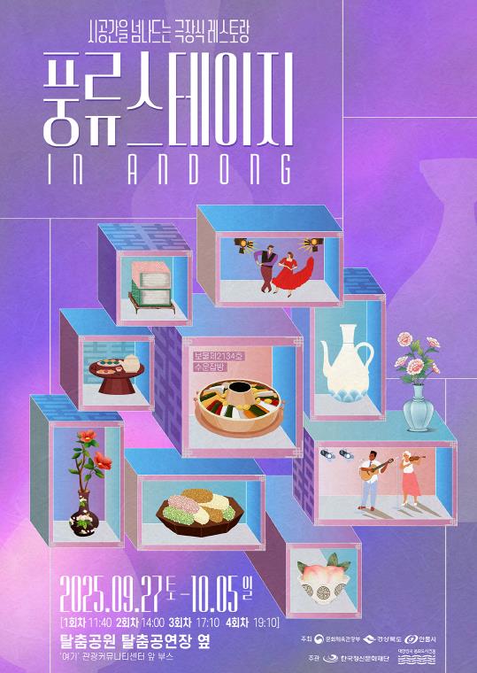 [파이낸셜경제=김지훈 기자] 안동시와 한국정신문화재단은 대한민국 문화도시 조성사업의 일환으로 '풍류 스테이지 in Andong' 극장식 레스토랑을 오는 9월 27일부터 10월 5일까지 안동국제탈춤페스티벌 행사장에서 선보인다.