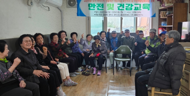 | ▲ 교촌동 경로당 어르신들이 수지침과 요가를 중심으로 한 안전 및 건강교육을 듣고, 기념촬영을 하고 있다. |