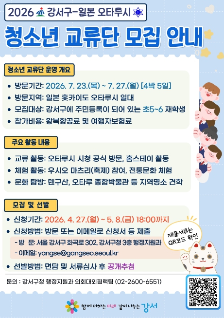 모집 대상은 강서구에 주민등록이 되어 있고, 해외여행이 가능한 초등학교 5~6학년 학생 10명이다. 도시 간 상호 교류를 위해 참가 학생들은 2027년 오타루시 청소년 교류단이 구를 방문할 때 홈스테이를 제공하고 함께 활동에 참여해야 한다.