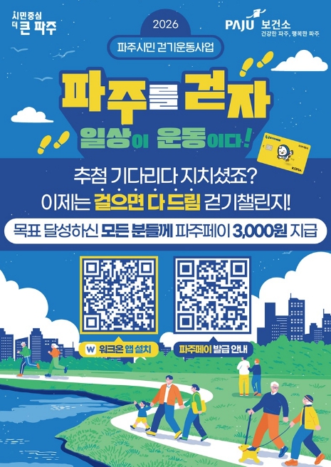 이번 개편의 핵심은 기존 ‘추첨 방식’을 폐지하고, 목표 달성자 전원에게 특전을 지급하는 방식으로 전환한 것이다. 이에 따라 시민들은 더 이상 당첨 여부를 기다릴 필요 없이 정해진 걸음 수 달성과 함께 다양한 미션을 수행하면 누구나 파주페이 3천 원을 받을 수 있어, 걷기 실천에 대한 참여 문턱이 크게 낮아질 전망이다.