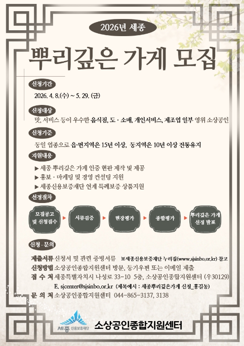 [파이낸셜경제=김영란 기자] 세종특별자치시가 세종시만의 전통과 특색을 갖춘 장수 소상공인 업소를 발굴·육성하기 위해 2026년 ‘세종 뿌리 깊은 가게’ 대상자를 모집한다고 8일 밝혔다.