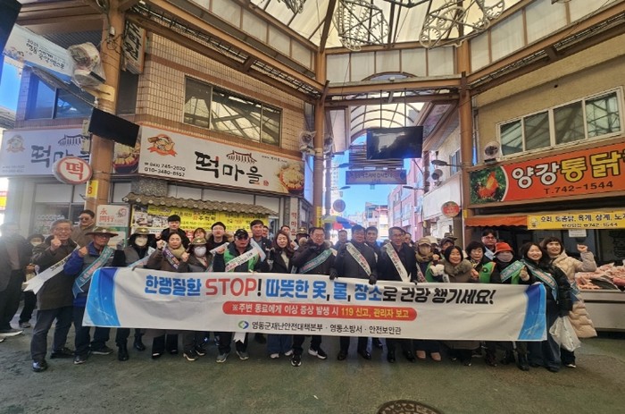 이번 캠페인은 설을 맞아 주민들에게 한파 대비 행동요령을 알리고, 설 연휴 기간 지켜야 할 안전수칙과 안전정보를 제공하기 위해 마련됐다. 충청북도 안전정책과, 영동군 재난안전과, 영동소방서, 안전보안관, 자율방재단 등 60여 명이 참여했다.