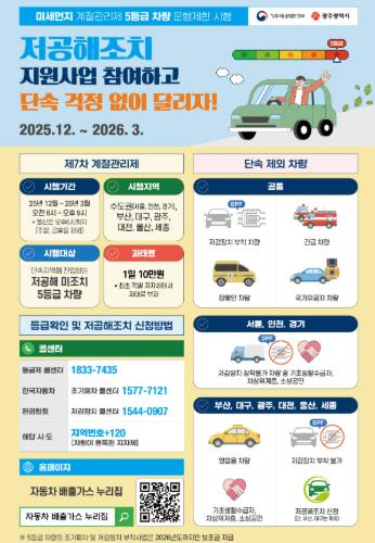 [파이낸셜경제=김예빈 기자] 광주광역시는 12월1일부터 내년 3월31일까지 4개월간 ‘제7차 미세먼지 계절관리기간’으로 운영, 저공해 조치를 하지 않은 배출가스 5등급 차량의 운행을 제한한다.