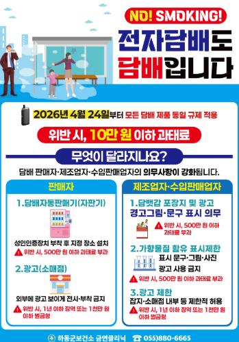 신유정 보건소장은 “담배사업법 개정을 통해 전자담배에 대한 관리 체계가 마련된 만큼 충분한 안내와 지속적인 점검을 병행하겠다”라며, “군민들이 혼선 없이 변화된 제도를 이해하고 준수하게 하여 쾌적한 하동군을 만드는 데 최선을 다하겠다”라고 말했다.