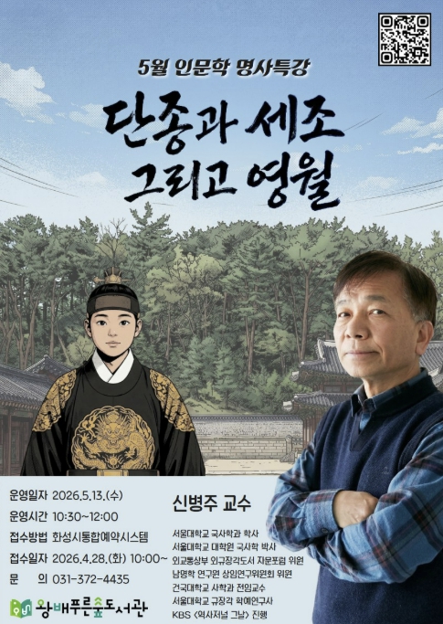 [파이낸셜경제=김기보 기자] 화성시문화관광재단 운영하는 왕배푸른숲도서관이 오는 5월 13일, 지역 주민들을 위해 역사학자 신병주 교수를 초청하여 5월 인문학 명사특강을 개최한다.