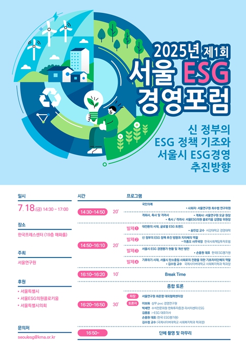 [파이낸셜경제=김예빈 기자] 서울연구원은 오는 7월 18일 오후 2시 30분, 한국프레스센터 19층 매화홀에서 ‘신정부의 ESG 정책 기조와 서울시 ESG 경영 추진방향’을 주제로 제1회 '2025 서울 ESG 경영포럼'을 개최한다. 이번 포럼은 서울특별시의회와 서울특별시가 후원한다.
