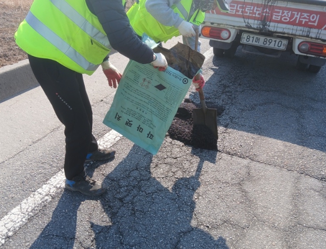 | ▲ 천안시 도로보수원들이 겨울철 폭설과 염화칼슘 영향으로 훼손된 도로 포트홀 구간에 아스콘을 충진하며 긴급 복구 작업을 진행하고 있다 |