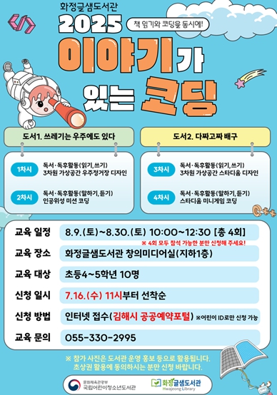 [파이낸셜경제=김예빈 기자] 김해시 화정글샘도서관이 국립어린이청소년도서관에서 주최하는 ‘2025년 이야기가 있는 코딩’ 공모사업에 선정돼 어린이 디지털 독서 진흥 프로그램을 운영한다고 15일 밝혔다.