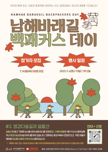 ‘남해바래길 백패커스 데이’ 3회차 행사는 남해바래길 10코스(앵강다숲길), 11코스(다랭이지겟길), 그리고 설흘산을 배경으로 1박 2일간 펼쳐지며, 지역농산물을 활용한 소셜 다이닝 등 다채로운 프로그램으로 구성될 예정이다.