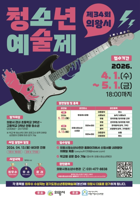 [파이낸셜경제=김기보 기자] 의왕시청소년재단 산하 의왕시청소년수련관은 지역 청소년의 예술적 재능과 끼 발산의 장인 ‘제34회 의왕시청소년예술제’의 참가자를 5월 1일까지 모집한다고 밝혔다.