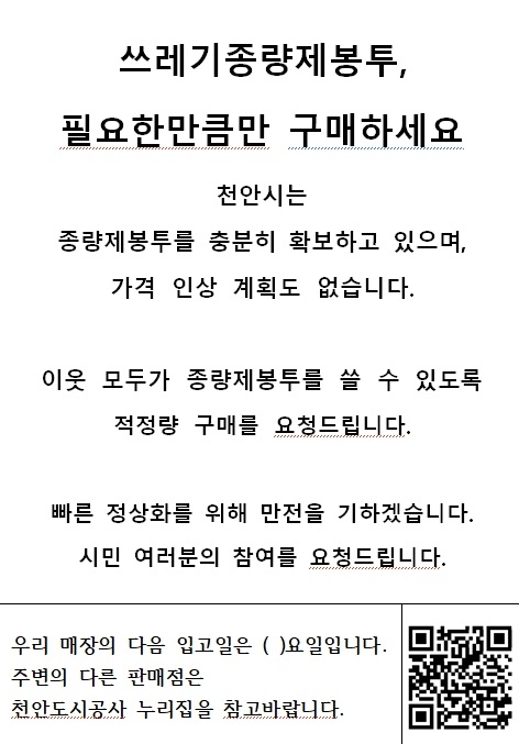 김석필 천안시장 권한대행 부시장은 “부정확한 정보로 인한 불안 심리가 시장 혼란의 가장 큰 원인”이라며, “표준화된 안내문을 통해 투명한 정보를 제공하고 철저한 현장 관리로 시민들이 안심하고 봉투를 구매할 수 있도록 노력하겠다”고 말했다.