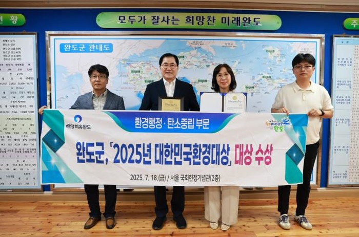 [파이낸셜경제=김예빈 기자] 완도군이 지난 7월 18일 서울 국회 헌정기념관에서 열린‘ 제20회 2025 대한민국 환경 대상’ 시상식에서 환경 행정 탄소중립 분야의 대상을 수상하는 영예를 안았다.