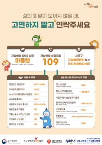 이와 함께 ▲서구 등 5개 자치구 21개 동의 ‘생명존중안심마을’ 조성 ▲일산화탄소 중독 예방 위한 생명사랑 실천가게 운영 ▲자살다빈도 장소 야간 로고젝터 설치 ▲‘생명지구대’ 운영 등 지역 맞춤형 예방활동도 꾸준히 추진 중이다.