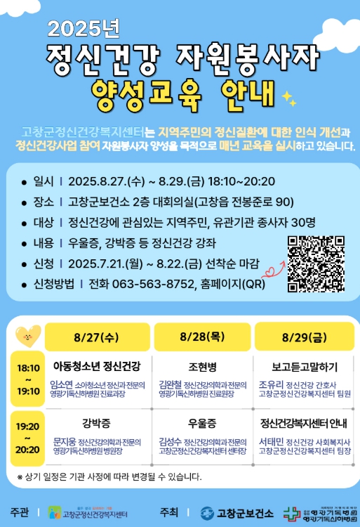 [파이낸셜경제=김예빈 기자] 고창군정신건강복지센터가 오는 8월27~29일 고창군보건소 2층 대회의실에서 실시하는 ‘정신건강자원봉사자 양성교육’에 참여 주민을 모집한다.