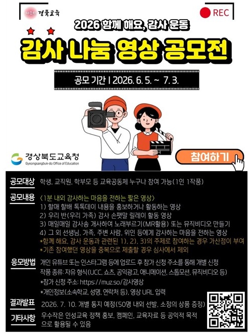 임종식 교육감은 “이번 감사 나눔 영상 공모전이 감사의 가치를 일상에서 실천하고 확산하는 계기가 되길 바란다”라며, “앞으로도 학생뿐 아니라 교직원, 학부모 모두가 서로를 존중하고 고마움을 나누며 따뜻한 교육공동체를 만들어갈 수 있도록 적극 지원하겠다”라고 말했다.
