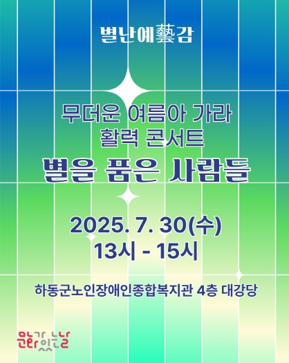 [파이낸셜경제=김예빈 기자] 하동군이 오는 30일 13시, 하동노인장애인종합복지관에서 ‘2025 문화가 있는 날 '구석구석 문화배달' - 별난예(藝)감! 별을 품은 사람들’ 행사를 개최한다.