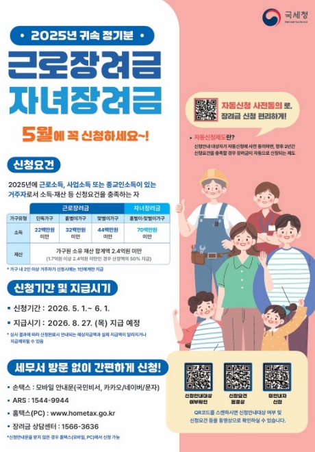 시 관계자는 “근로·자녀장려금은 저소득 가구의 실질 소득을 지원하는 중요한 제도인 만큼, 대상자들이 신청 기간을 놓치지 않도록 적극적인 참여를 당부드린다”고 말했다.