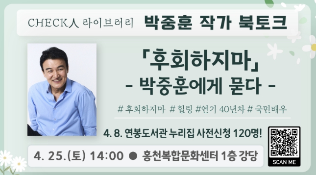 [파이낸셜경제=조성환 기자] 홍천 군립 도서관이 오는 4월 25일 오후 2시 홍천 복합 문화센터 1층 강당에서 배우 겸 작가 박중훈을 초청해 2026년 ‘체크인 라이브러리’의 첫 번째 북토크를 개최한다.