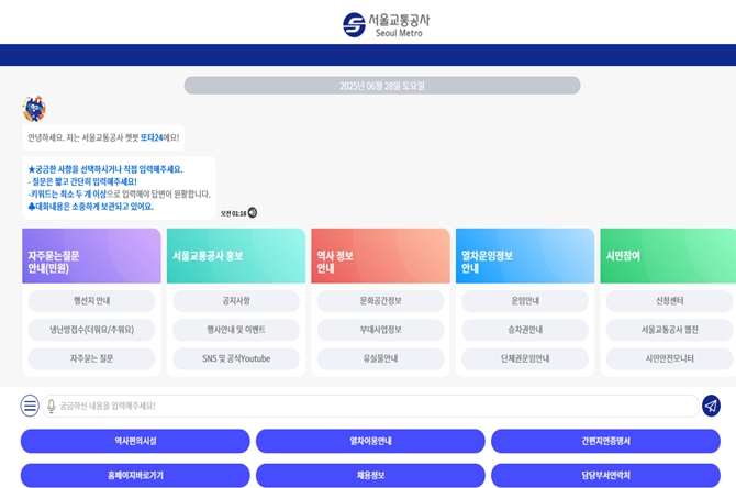 공사는 지하철 이용 시민들의 편의를 높이기 위해 지난해 1월부터 본격적으로 24시간 AI 기반 챗봇 민원 상담 서비스 ‘또타24’를 도입해 운영하고 있다. 작년 한 해만 43만 건이 넘는 민원을 챗봇으로 처리했다.